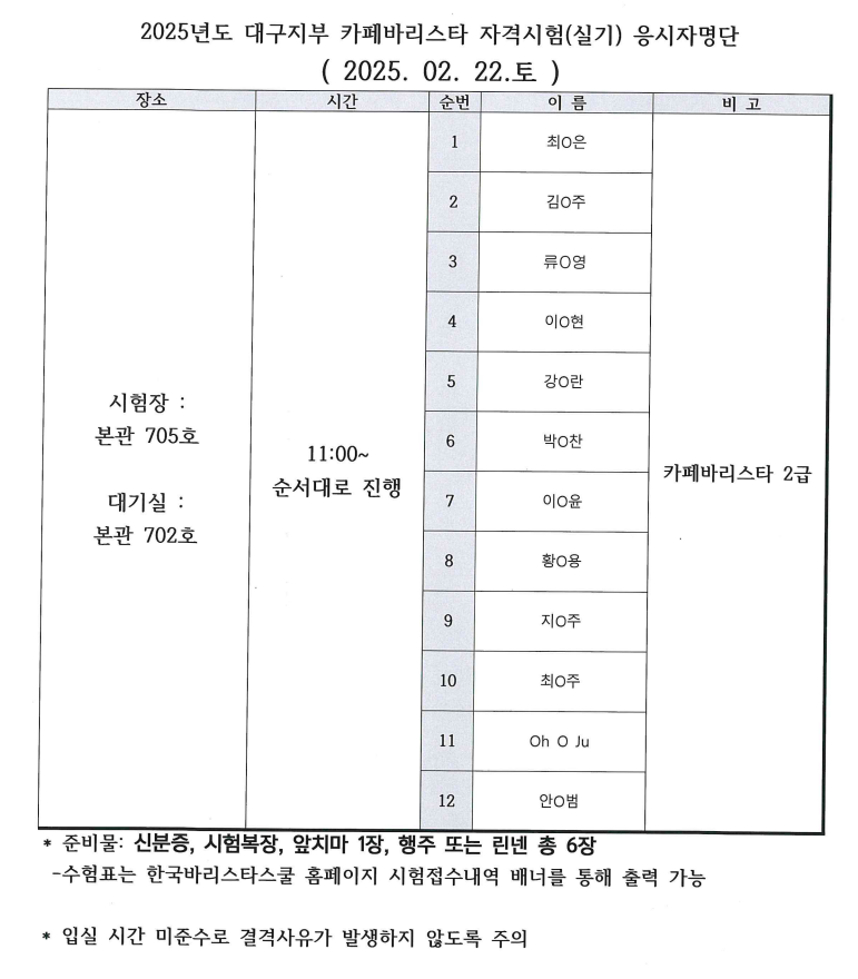 | 30 | 25.02.22.(토) 커피바리스타 실기시험 응시 명단 | 관리자 | 758 | 2025.02.20 |